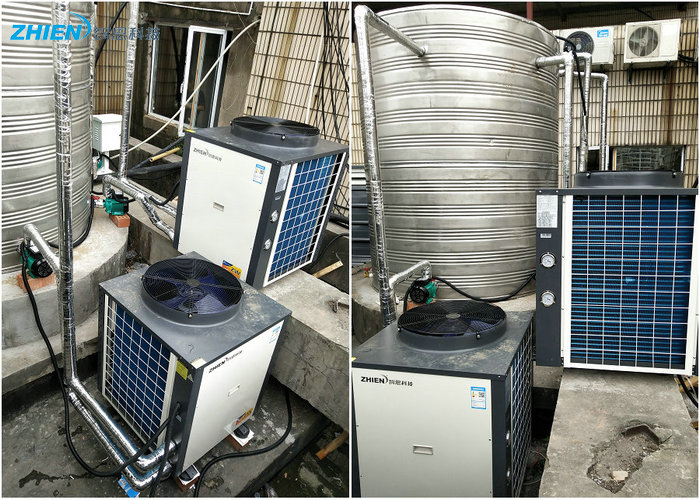 紹興酒店客房熱水項(xiàng)目采用了智恩空氣能2臺(tái)5匹機(jī)器,5噸水箱。