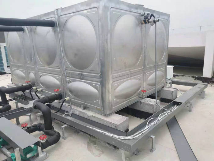 蘭溪黨校空氣能熱水工程:智恩兩臺空氣能10匹兩臺(ZN-KFDX-100ll)+不銹鋼方形保溫水箱10噸一個(gè)。