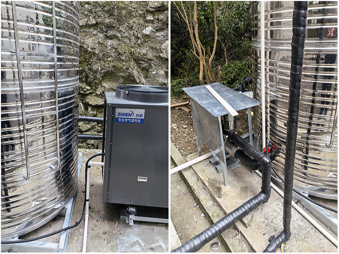 湖北黃岡一中學(xué)熱水熱水系統(tǒng)采用了智恩10匹空氣能熱泵熱水機(jī)( ZN-KFDX-100ll)+10噸圓形不銹鋼保溫水箱。